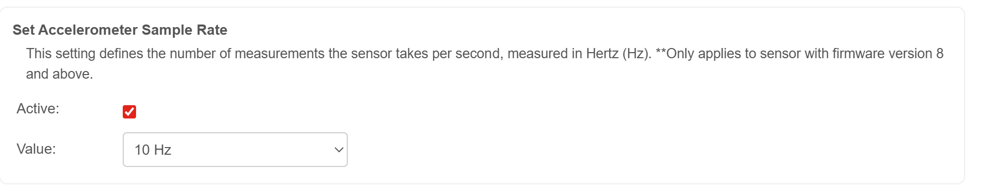 - In the case of the Accelerometer, you have the Set Accelerometer Threshold. If vibration values go above this threshold, the sensor detects this as a signal that the machine is ON. If vibration values go below this threshold, the sensor detects this as the machine is OFF. (it also calculate machine uptime in seconds).