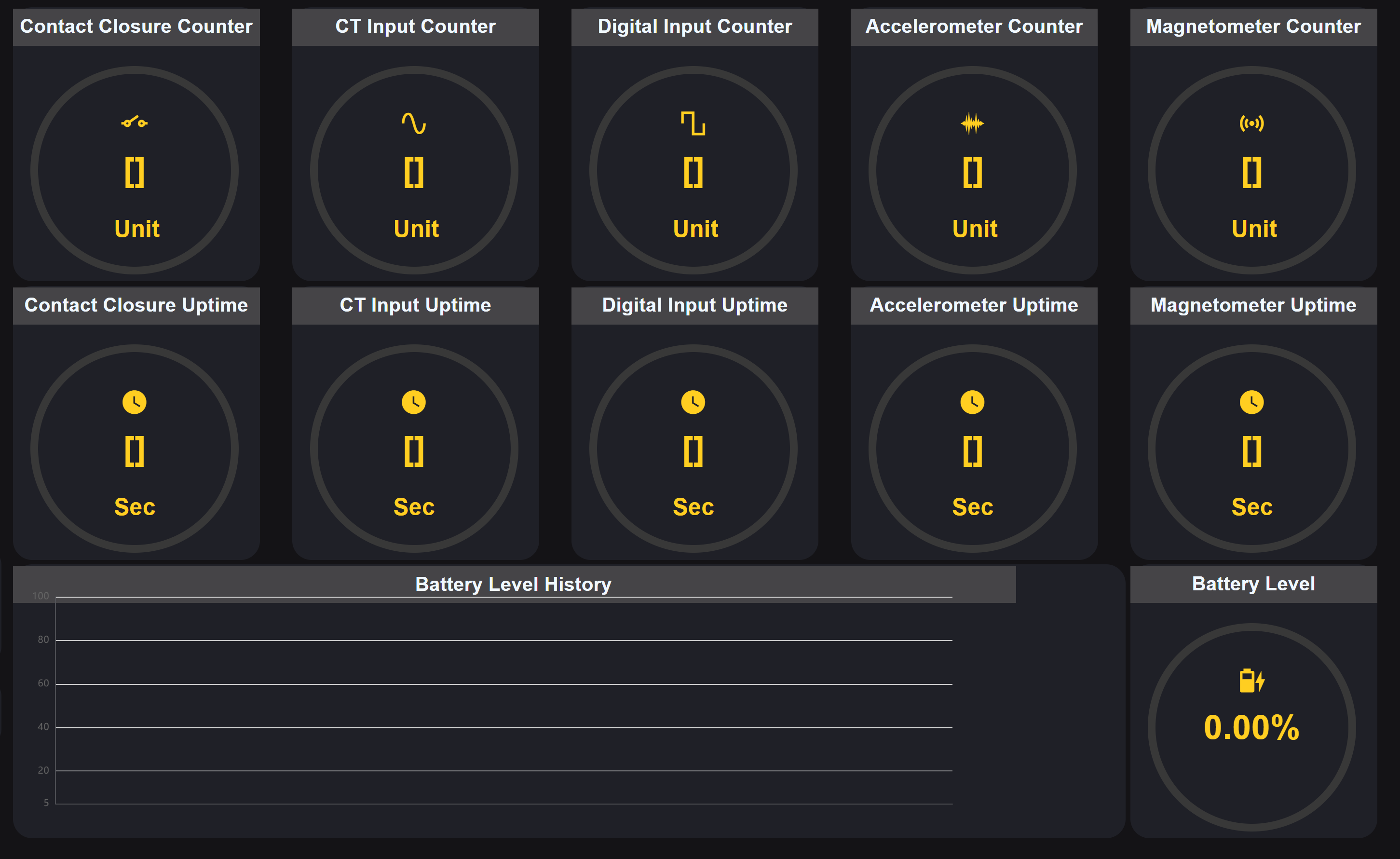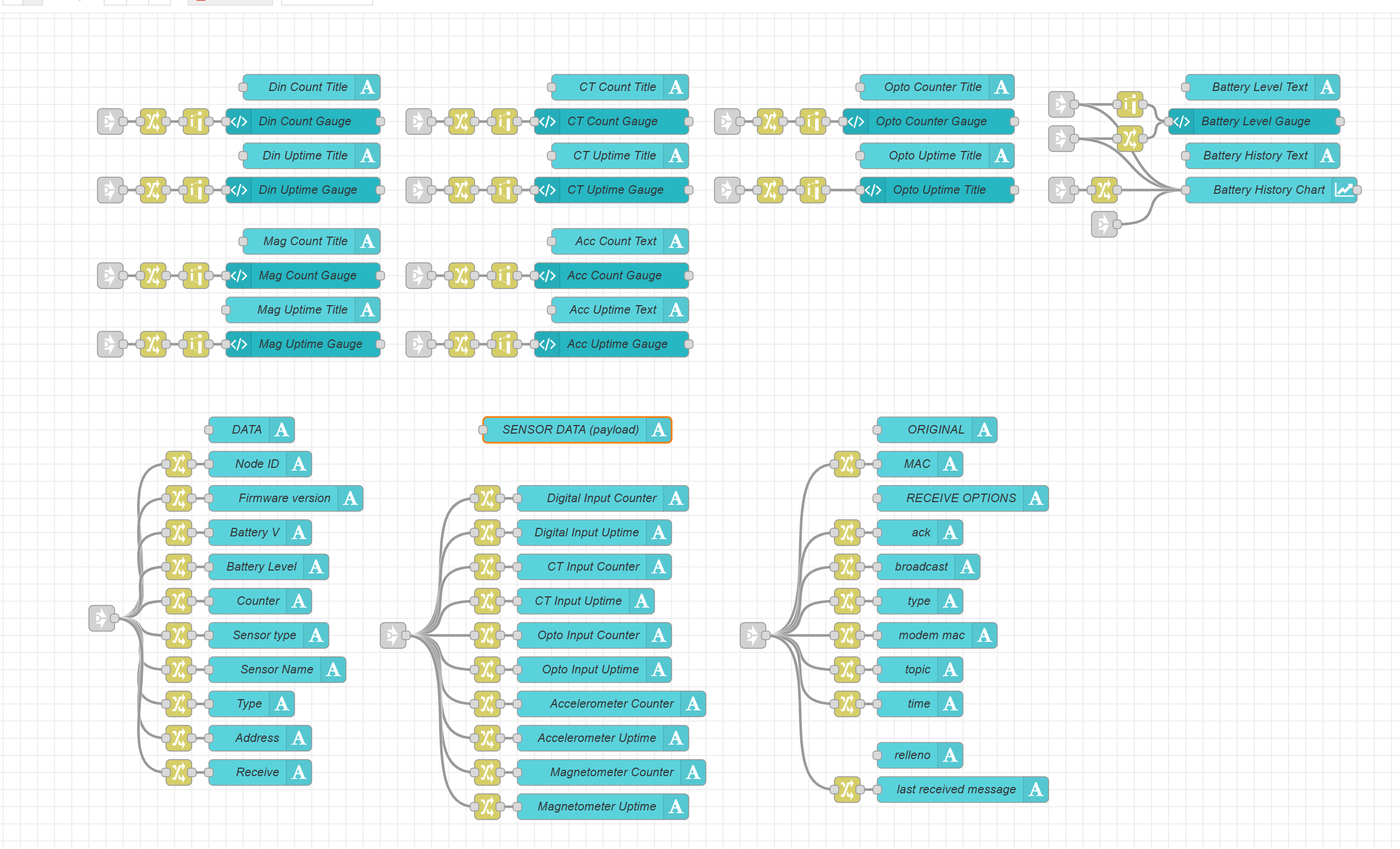Since this device supports different kinds of input, the dashboard template will display the actual counters and uptime (in seconds) values, along with a battery percentage history. It is designed as a simple template to view the sensor data in an easy-to-read format. In order to get started I would recommend to test the behavior using the Node-RED editor into the Debug window.
