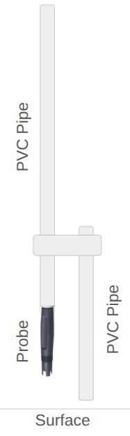 The white support pole shown is a standard PVC pipe. A second, shorter PVC pipe should be used to extend down and touch the bottom of the tank/sewer, ensuring that the probe assembly starts above the end of this pipe.