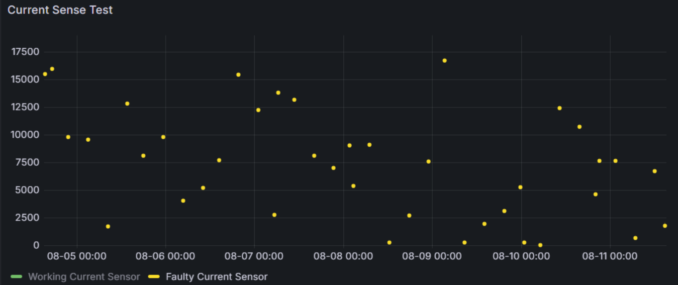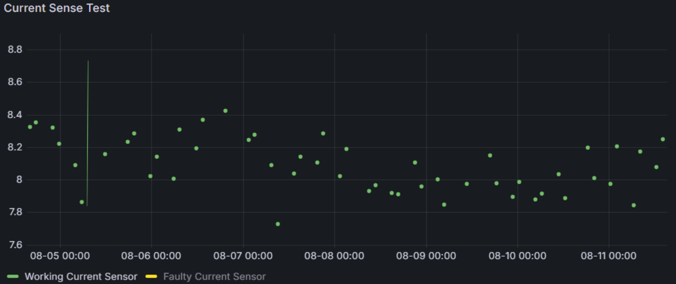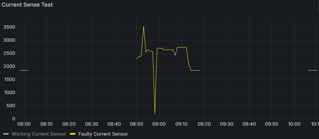 In the plot attached you can see measurements in application. Starting on the left (while clamped to line with ~8A draw), then you can see where I disconnected the current clamp, and then where I disconnected the internal cable briefly. Finally you can see a drop when I plugged the current clamp back in.