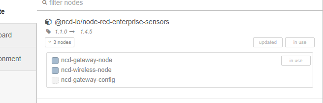 Check Version: Go to the Node-RED main menu, click Manage palette, and locate the @ncd-io/node-red-enterprise-sensors library to see your current version.