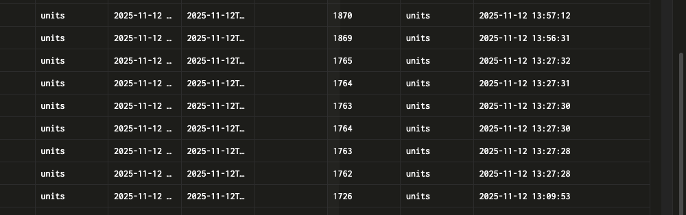 Could you please carefully check if the sensor data matches the corresponding values in your database? For example, at the timestamp ‘13:27:28’, the value recorded is 1763, which then increases to 1764. However, the subsequent entry shows 1763 again. This fluctuation (a decrease in an accumulating counter) should not be possible.