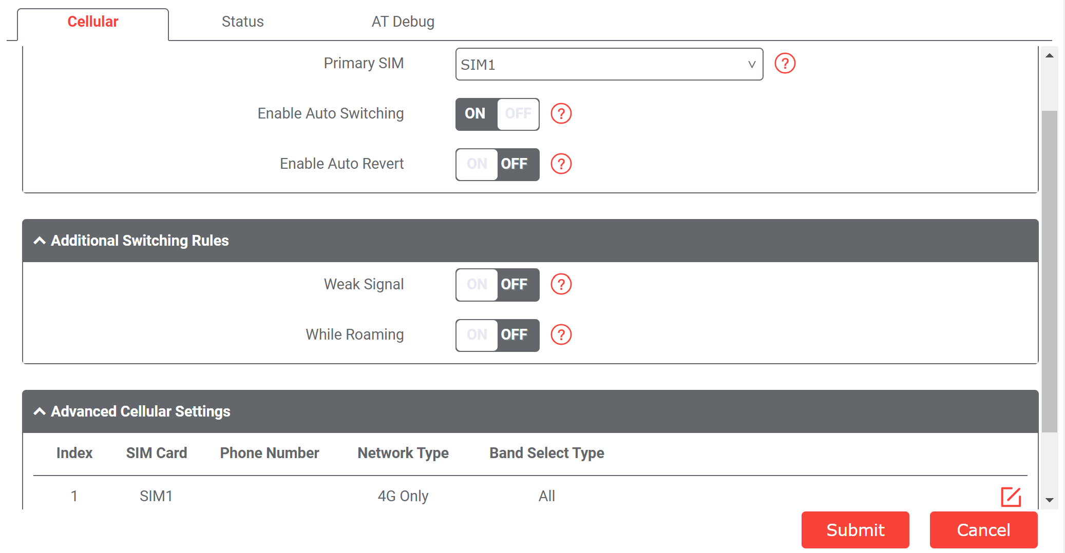 Can you send a screenshot of your cellular configuration? You can find it through the Network Management UI > Interface > Cellular as well as its status (tab along the top of that page)?