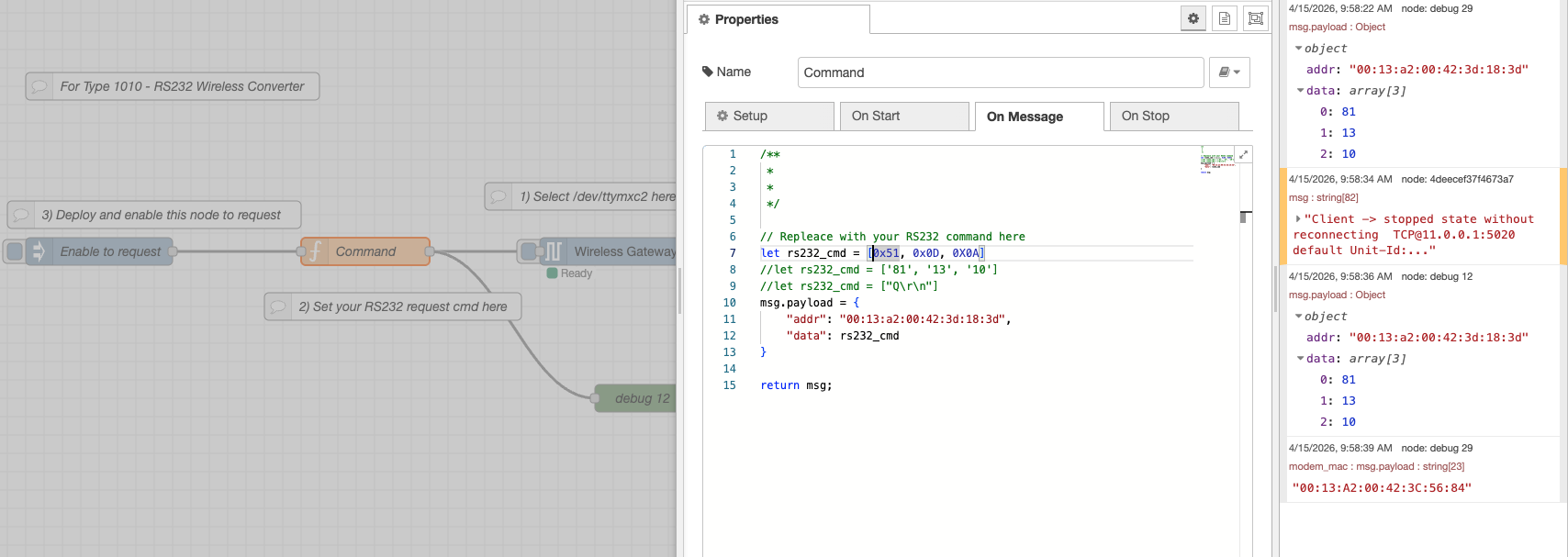 Hi @danempiric you can configure the NCD RS232 Device using the Wireless Device node (baud rate, stop bit, parity, etc). Then you can use this flow to transmit a RS232 command in Hex to request.