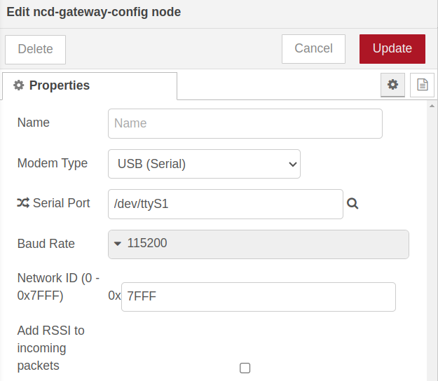 Double-clicking the ncd-gateway-config node will open the serial settings. Could you share a screenshot of this with us? It should look like this: