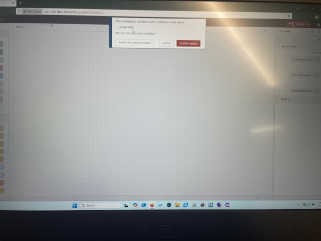 For some reason, we are unable to update an existing Flow on Node-Red. We are getting a error message that indicates “unknown email config” node, although the referenced node is not used on any of the Flows. We get this error even when we try to deploy an empty Flow! see attached screen shots. The referenced node is the at the bottom of the list and is not used anywhere!