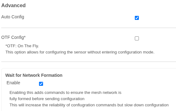 - Are you using a manual or automatic configuration? These sensors support OTF (On-the-Fly) configuration. I ask because the OTF Config checkbox is currently disabled on your Wireless Device nodes. This prevents the sensors from taking a new configuration when they send a FLY message.