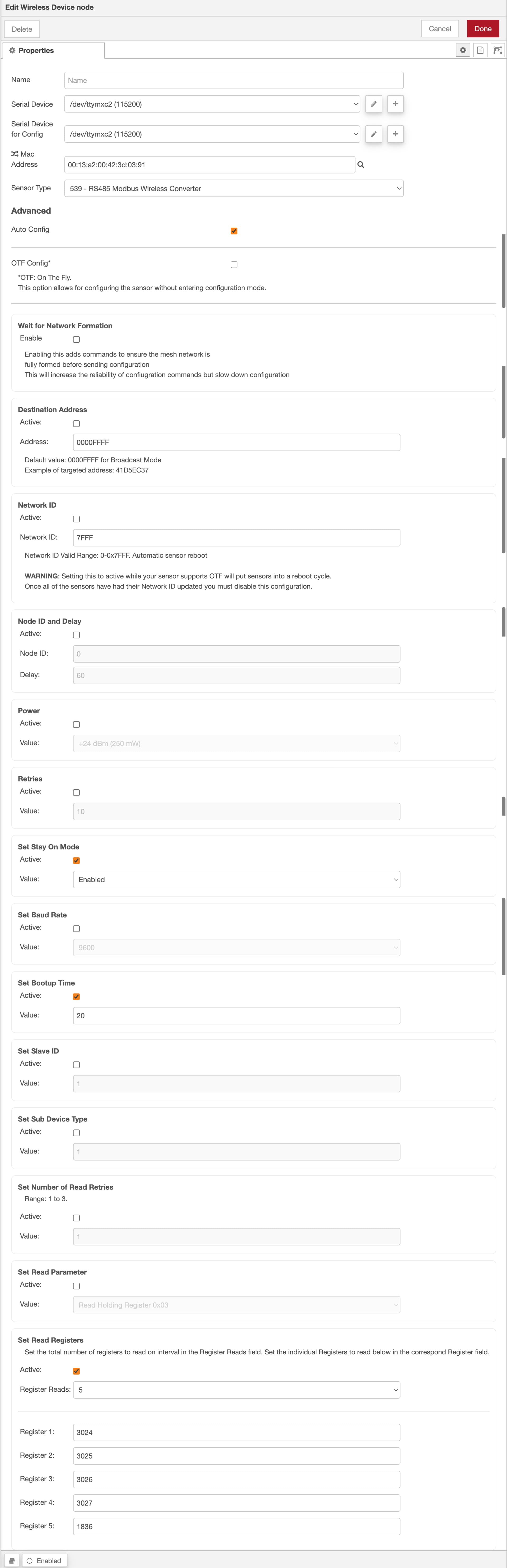 {“topic”:“sensor_data”,“data”:{“nodeId”:0,“firmware”:4,“battery”:“1.83”,“battery_percent”:“-64.25”,“counter”:152,“sensor_type”:539,“sensor_data”:{“subdevice_type”:1,“number_of_registers”:5,“status_24_31”:0,“status_16_23”:0,“status_8_15”:0,“status_0_7”:31,“data”:[128,0,128,0,128,0,128,0,7,233]},“sensor_name”:“RS485 Modbus Wireless Converter”,“type”:“sensor_data”,“addr”:“00:13:a2:00:42:3d:03:91”,“received”:1763159646319,“original”:{“mac”:“00:13:a2:00:42:3d:03:91”,“receive_options”:{“ack”:0,“broadcast”:0,“type”:“”},“data”:[127,0,4,2,57,152,2,27,0,1,5,0,0,0,31,128,0,128,0,128,0,128,0,7,233],“rssi”:{},“type”:“receive_packet”},“rssi”:81,“modem_mac”:“00:13:A2:00:42:3B:1B:B0”},“payload”:{“subdevice_type”:1,“number_of_registers”:5,“status_24_31”:0,“status_16_23”:0,“status_8_15”:0,“status_0_7”:31,“data”:[128,0,128,0,128,0,128,0,7,233]},“time”:1763159646324,“_msgid”:“da0fef7b86c8e833”}