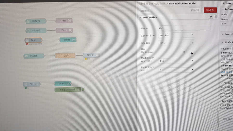 I would like to control this board with NodeRed and am looking for suitable nodes. I downloaded ncd-red-ads7828@1.1.5 but I always get “disconnected” from the ads7828 node (like in the pictures). Where is my mistake?