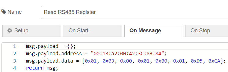 Modified my “Read RS485 Register” node in Node-Red by replacing the msg.payload.data with the broadcast set address command (eddited to array notation) from This Page