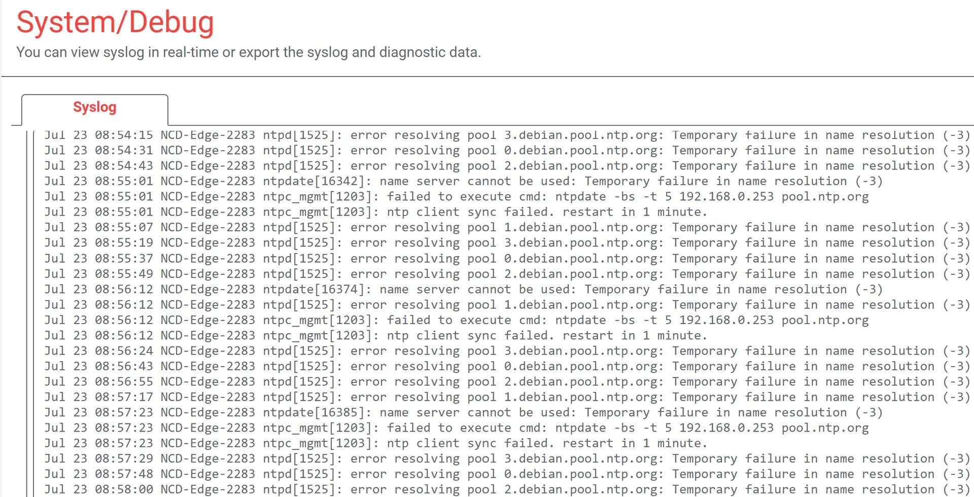 Our Robustel EG5100-A2FEA-NU is unable to reach our internal NTP server. IT has checked the settings for the port it is connected to and are unable to point to any issues with the configuration of the port.