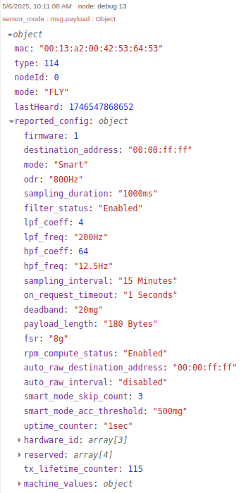 FYI, I have rest the unit. However, there is no FLY message, per your example, appearing on Node-Red.